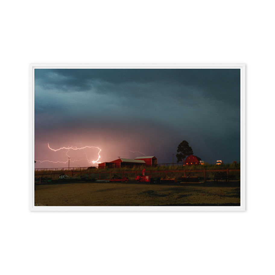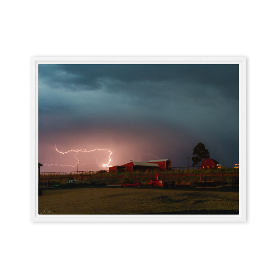 Bring the static discharge to your wall with the 90 Degrees Framed Canvas! This picture depicts a dramatic lightning strike sprawling over miles, bending in unnatural ways, over a farm. An upward streamer is visible coming off of one of the barns in the picture, showing how large of a strike this picture contains.
