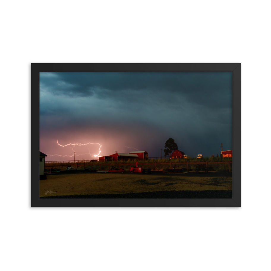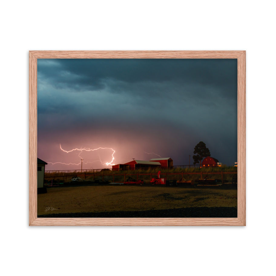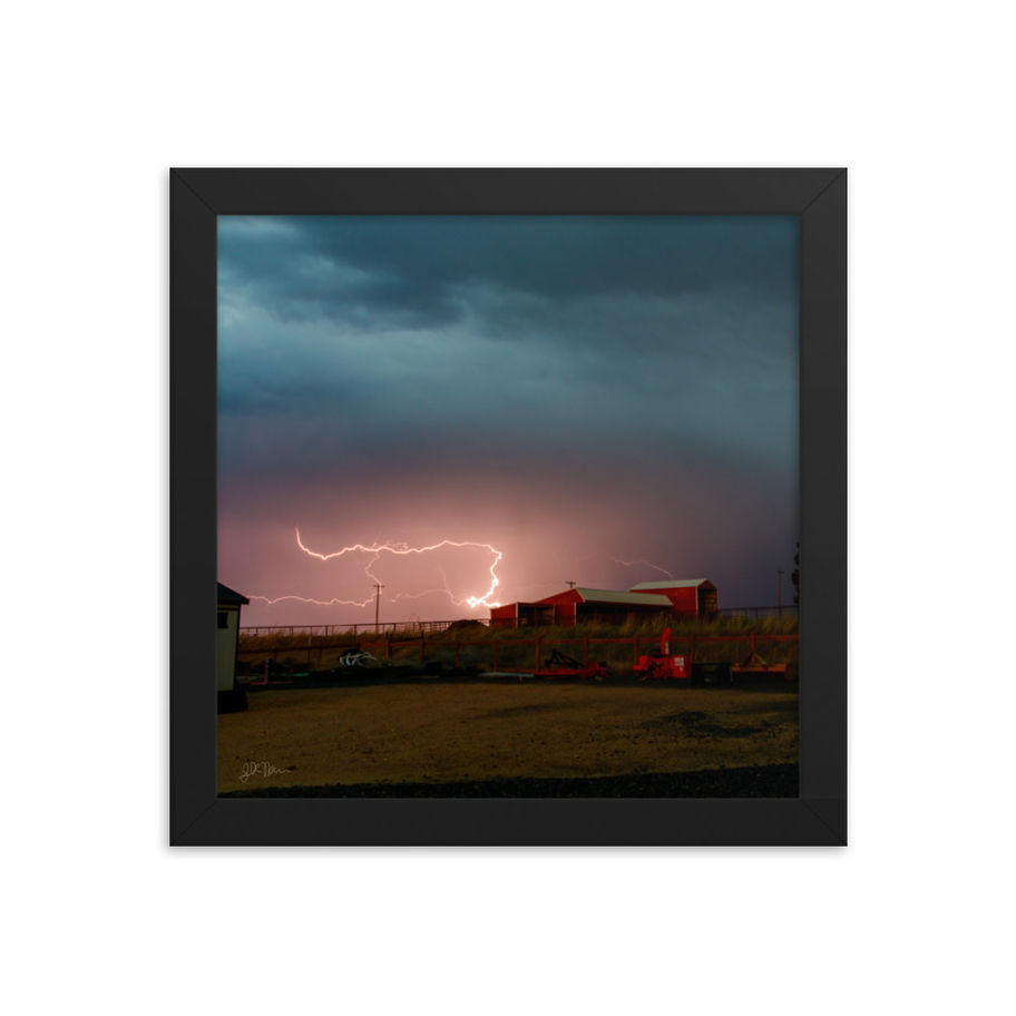 Bring the static discharge to your wall with the 90 Degrees Framed Print! This picture depicts a dramatic lightning strike sprawling over miles, bending in unnatural ways, over a farm. An upward streamer is visible coming off of one of the barns in the picture, showing how large of a strike this picture contains.