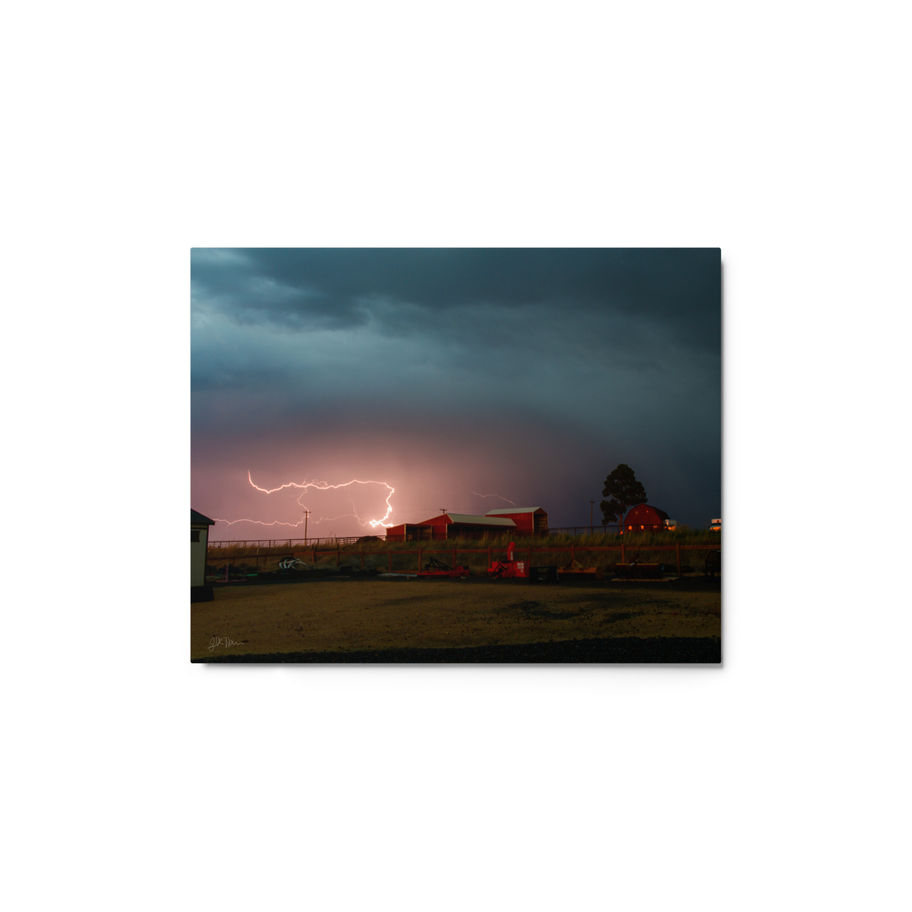 Bring the static discharge to your wall with the 90 Degrees Metal Print! This picture depicts a dramatic lightning strike sprawling over miles, bending in unnatural ways, over a farm. An upward streamer is visible coming off of one of the barns in the picture, showing how large of a strike this picture contains.