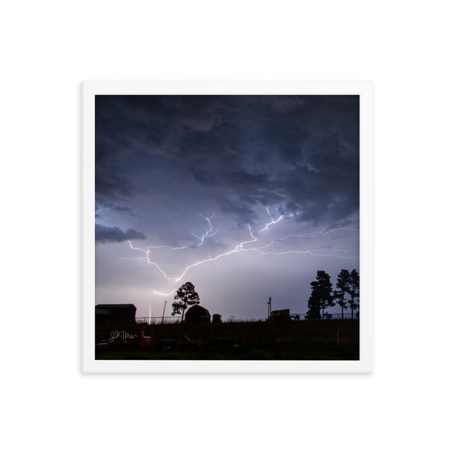 Capture the fleeting moment of nature's raw power with the Crawl Framed Print as lightning illuminates the rural landscape. This electrifying photograph showcases a jagged bolt streaking across the sky, momentarily turning night into day. The silhouettes of trees and farm buildings stand in stark contrast to the vibrant electric glow, creating a dramatic scene of beauty and awe.