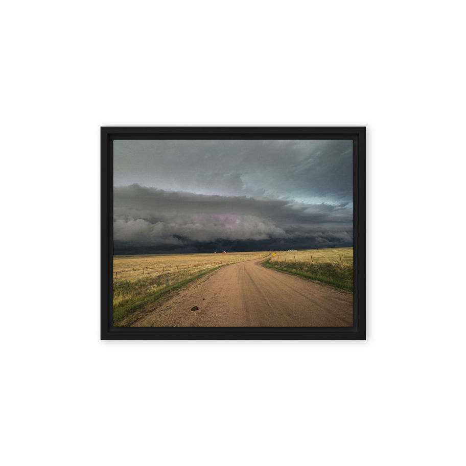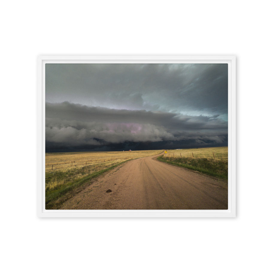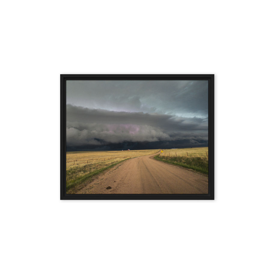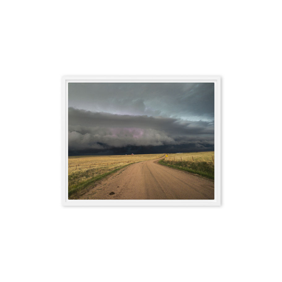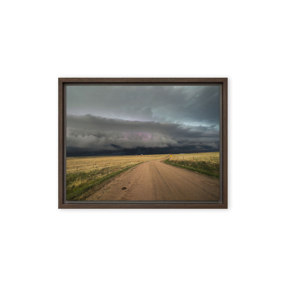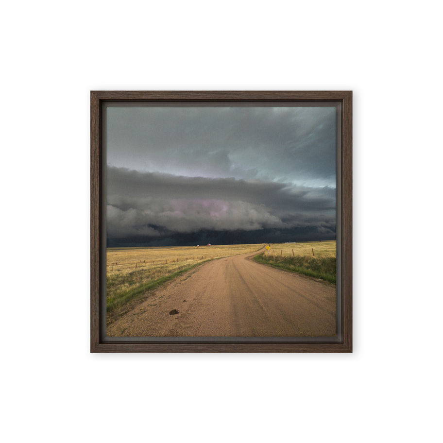 Confront the storm's fury with the Dead End Framed Canvas. This dramatic image from the June 8, 2024, QLCS storm depicts a dirt road abruptly ending as a colossal shelf cloud looms ominously overhead. The foreboding sky, pregnant with the threat of a tornado, contrasts with the serenity of the grasslands, creating a chilling reminder of nature's unpredictable power.