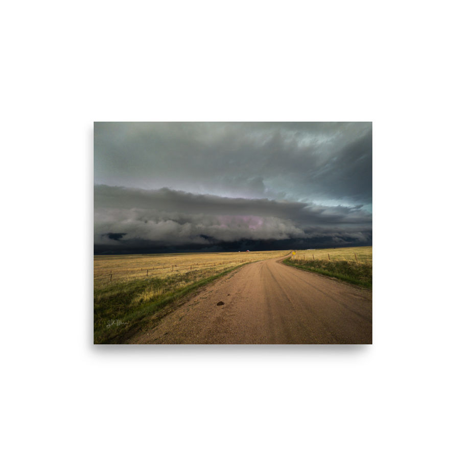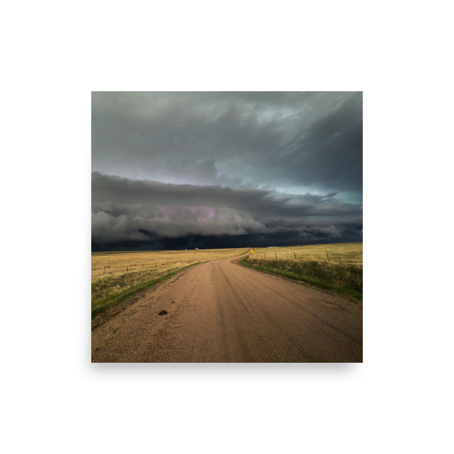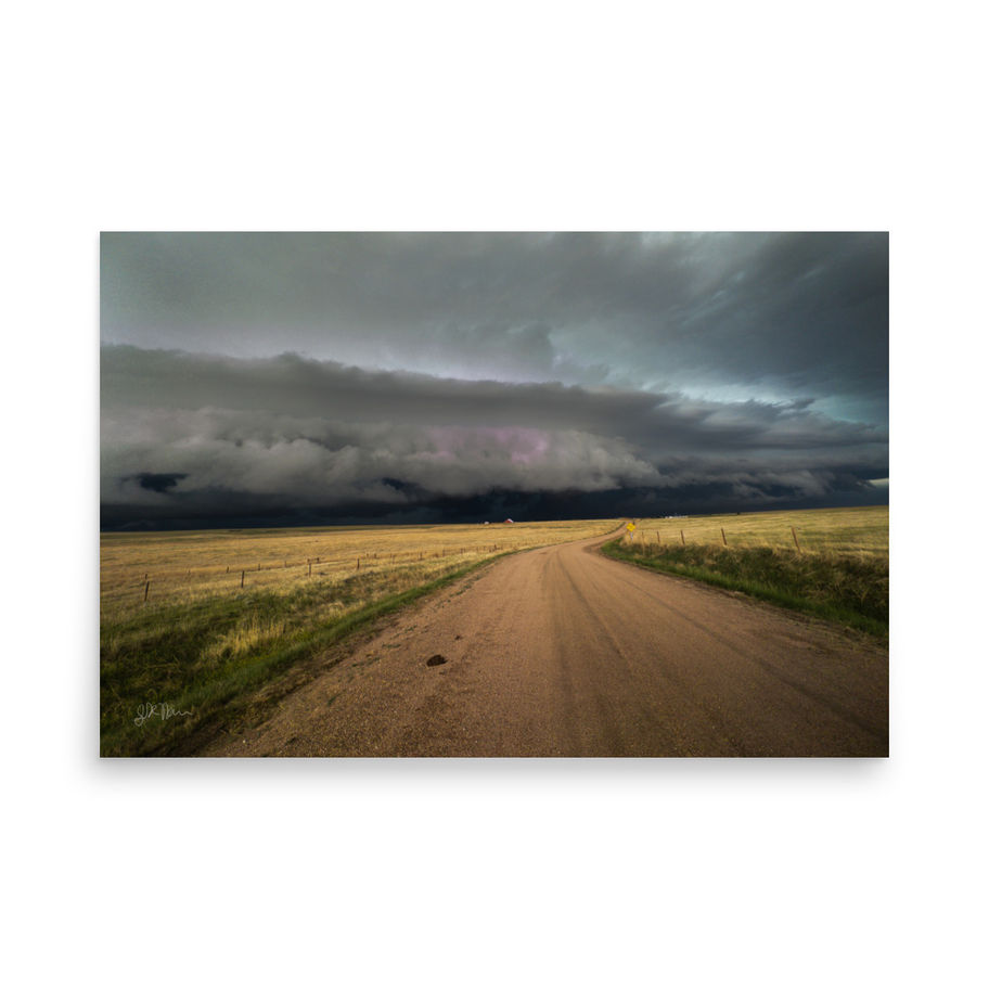 Confront the storm's fury with the Dead End Print. This dramatic image from the June 8, 2024, QLCS storm depicts a dirt road abruptly ending as a colossal shelf cloud looms ominously overhead. The foreboding sky, pregnant with the threat of a tornado, contrasts with the serenity of the grasslands, creating a chilling reminder of nature's unpredictable power.