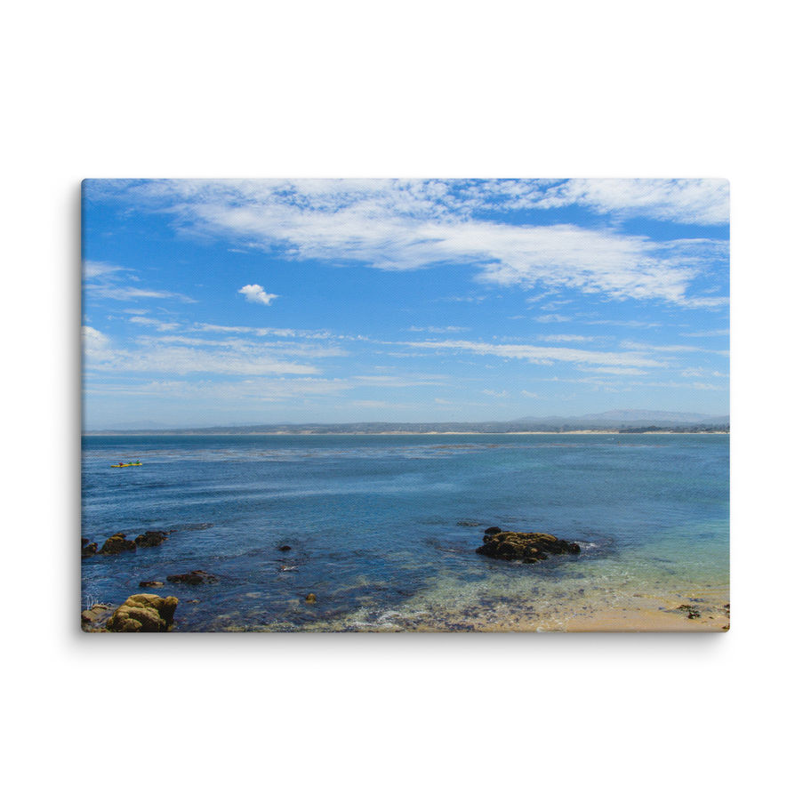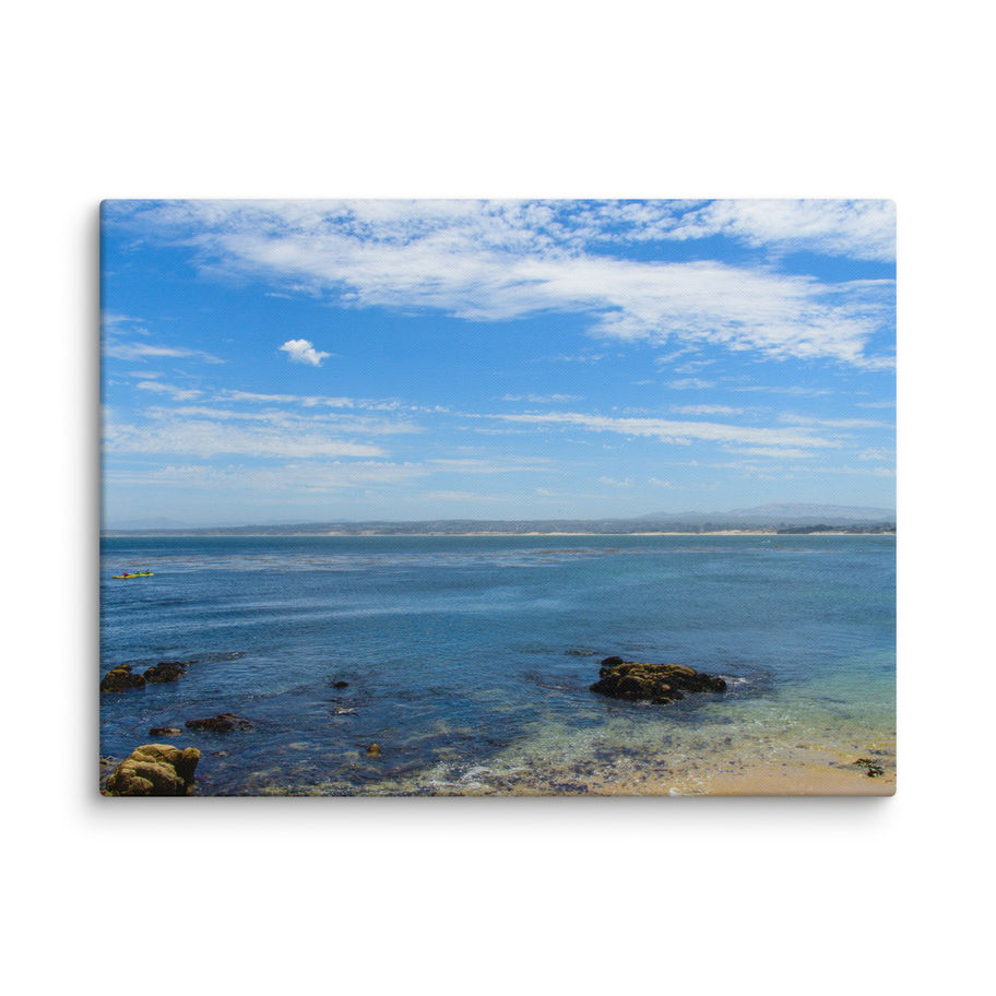 Experience the tranquil beauty of Monterey Bay with this captivating Canvas print! Immerse yourself in the serene blues of the Pacific Ocean, where the rugged coastline meets the vast expanse of the bay. A vibrant blue sky, dotted with fluffy white clouds, completes the idyllic scene, inviting you to escape to a peaceful sanctuary by the sea.