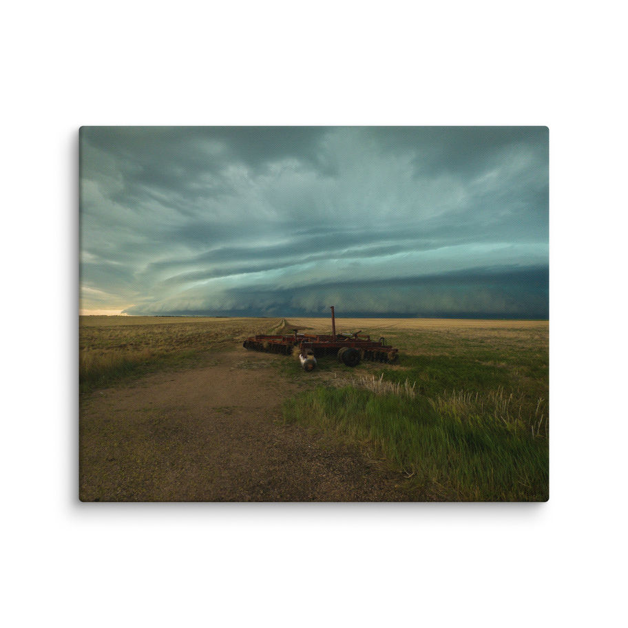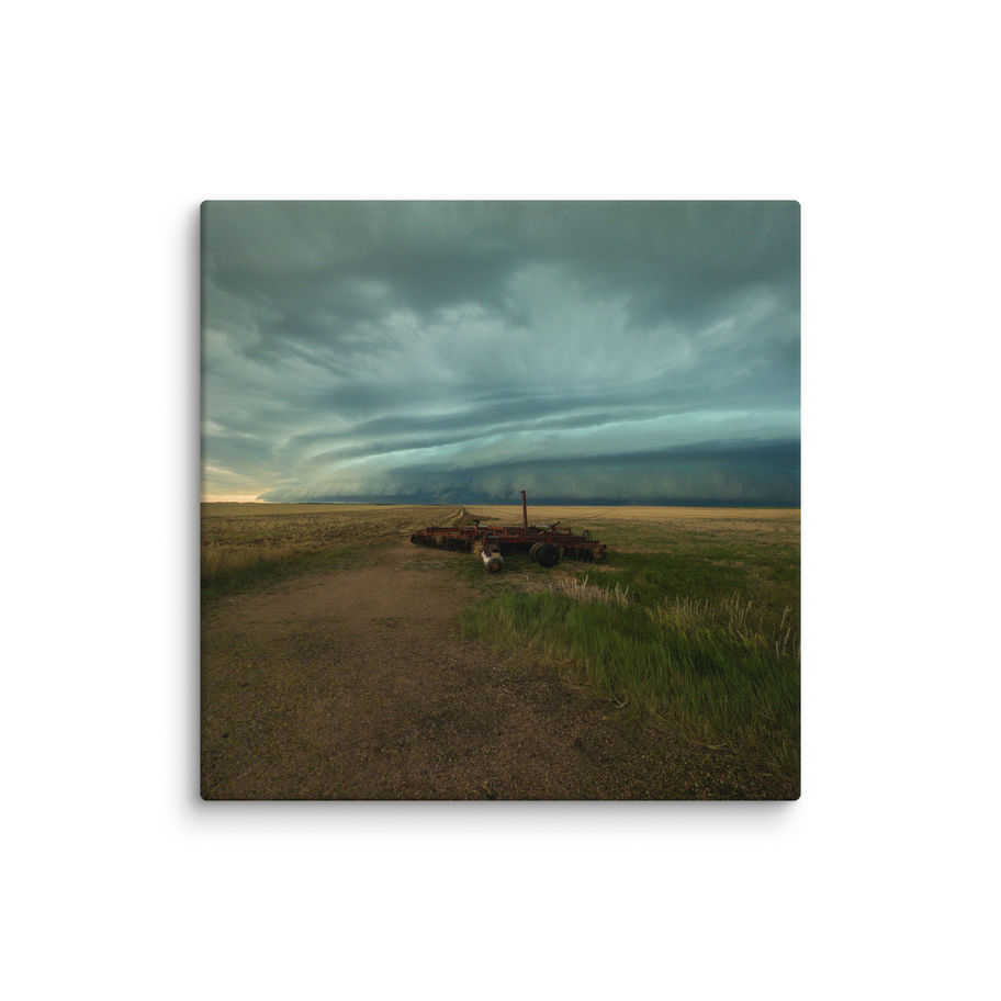 Capture the grandeur of nature with this stunning Canvas Print of the Grand Shelf. Taken on June 8, 2024, in Woodrow, Colorado, this photograph features farming equipment in the foreground, dwarfed by a massive, low-hanging turquoise shelf cloud that seems to almost touch the ground in the background. The contrast between the man-made and the natural elements creates a sense of awe and wonder. This canvas print will add a touch of drama and beauty to any room, featuring a vivid, fade-resistant print that you're bound to fall in love with.