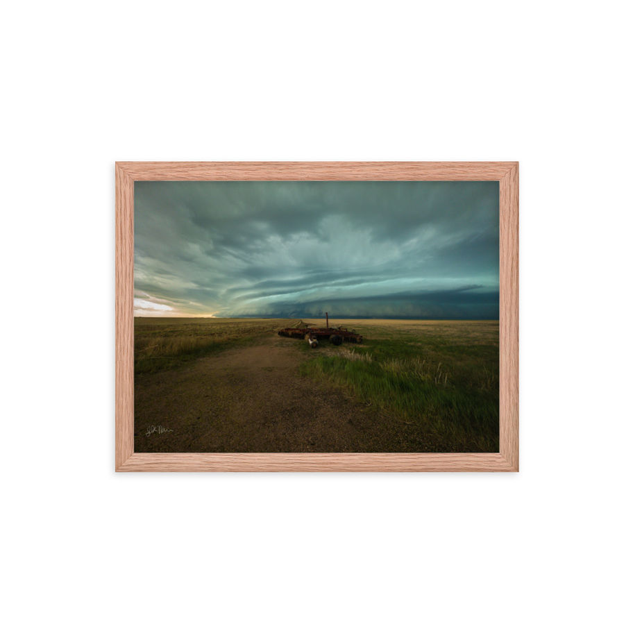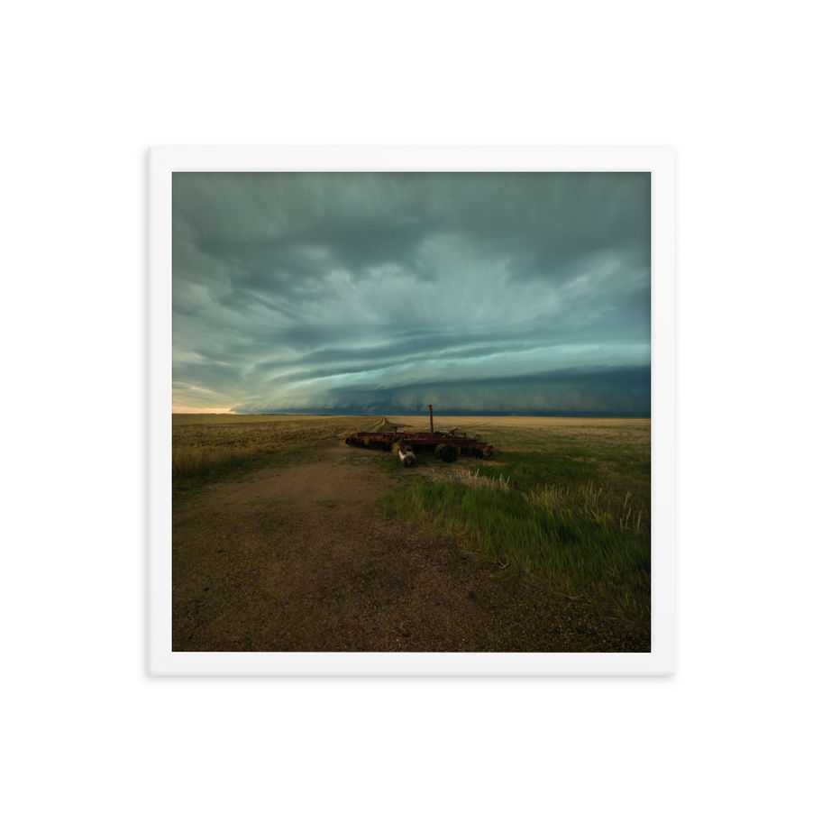Capture the grandeur of nature with this stunning Framed Print of the Grand Shelf. Taken on June 8, 2024, in Woodrow, Colorado, this photograph features farming equipment in the foreground, dwarfed by a massive, low-hanging turquoise shelf cloud that seems to almost touch the ground in the background. The contrast between the man-made and the natural elements creates a sense of awe and wonder. This framed print will add a touch of drama and beauty to any room, printed on thick matte paper, with a premium frame that adds an extra touch of class.