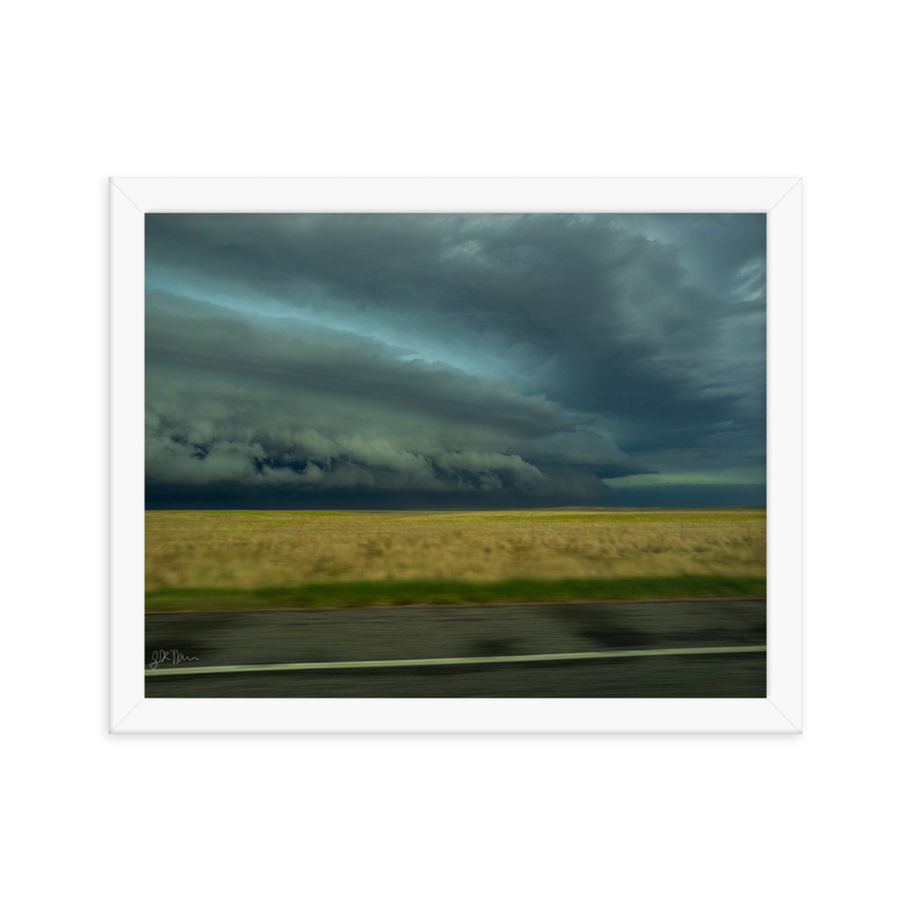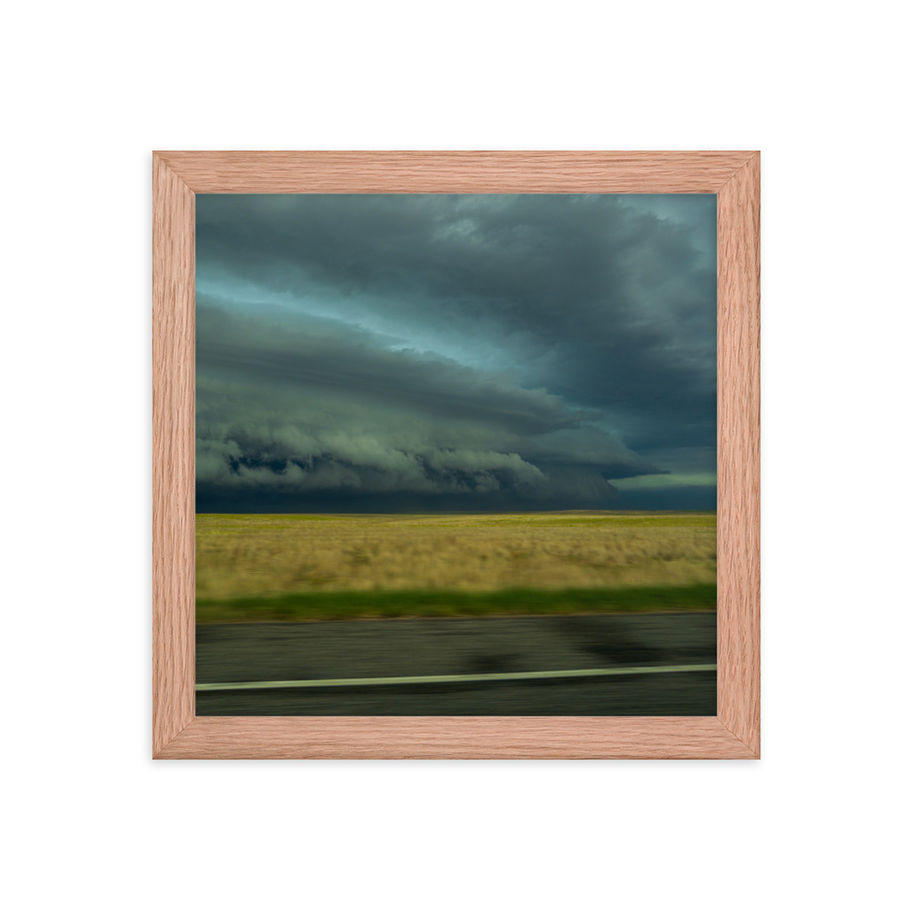 Witness the raw power and breathtaking beauty of a tornado warned supercell with the Woodrow Mesocyclone Framed Print! Captured within a quasi-linear convective system, also called a squall line, this awe-inspiring photograph showcases a rare glimpse of a mesocyclone churning across the vast plains, with a menacing wall cloud hinting at the potential for tornadoes (which ultimately did occur, but are not visible in this image). The ominous sky contrasts with the serene golden fields below, further emphasizing the low-hanging shelf clouds and creating a scene of dramatic intensity. This is printed on matte paper, and the wooden frame adds an extra touch of class.